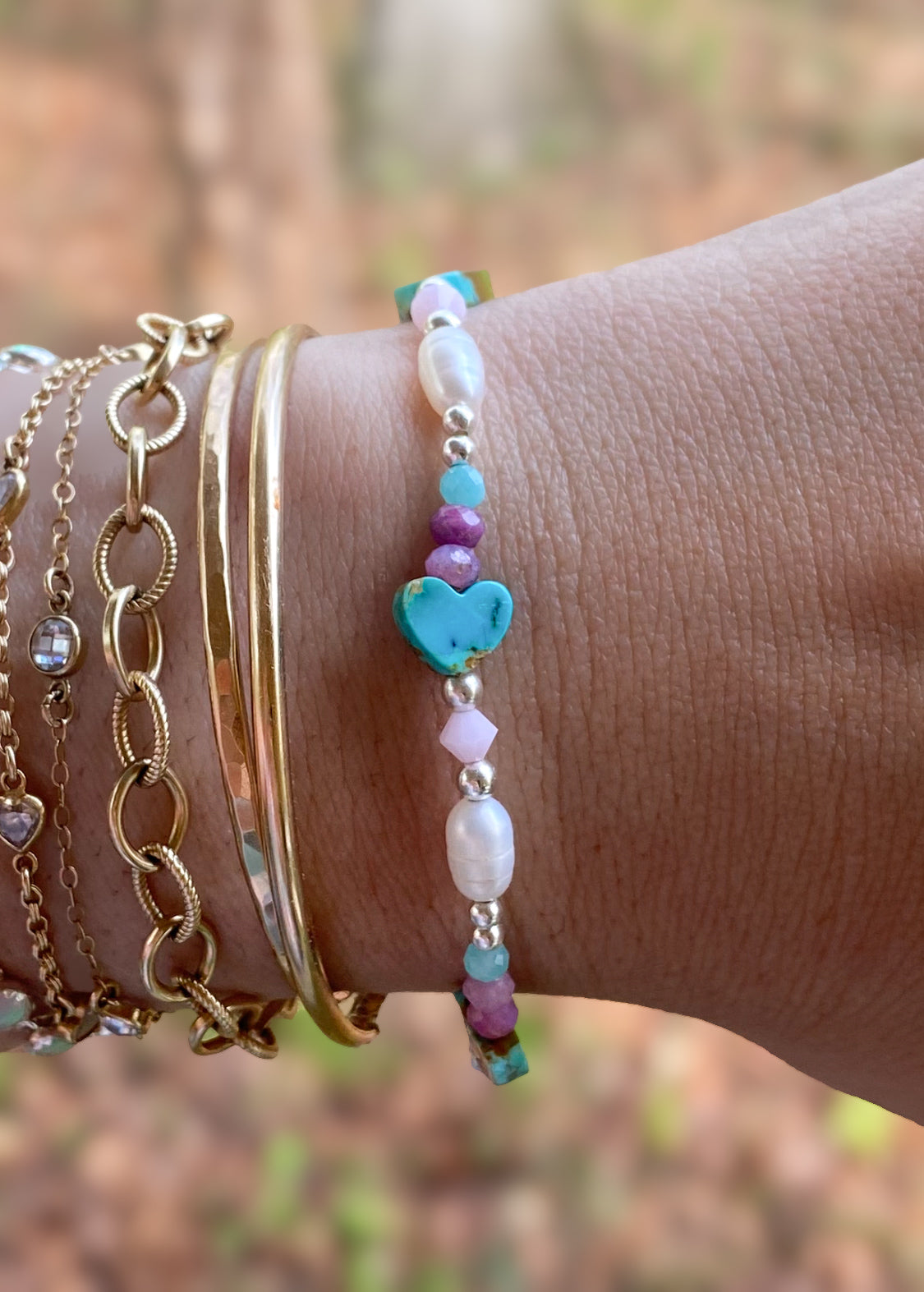Handcrafted stretch bracelet featuring Freshwater Pearls, Kingman Turquoise, Sterling Silver accents, Natural Ruby, and Swarovski Crystals. Designed on a durable stretch cord for easy wear, this bracelet blends classic charm with modern sparkle.