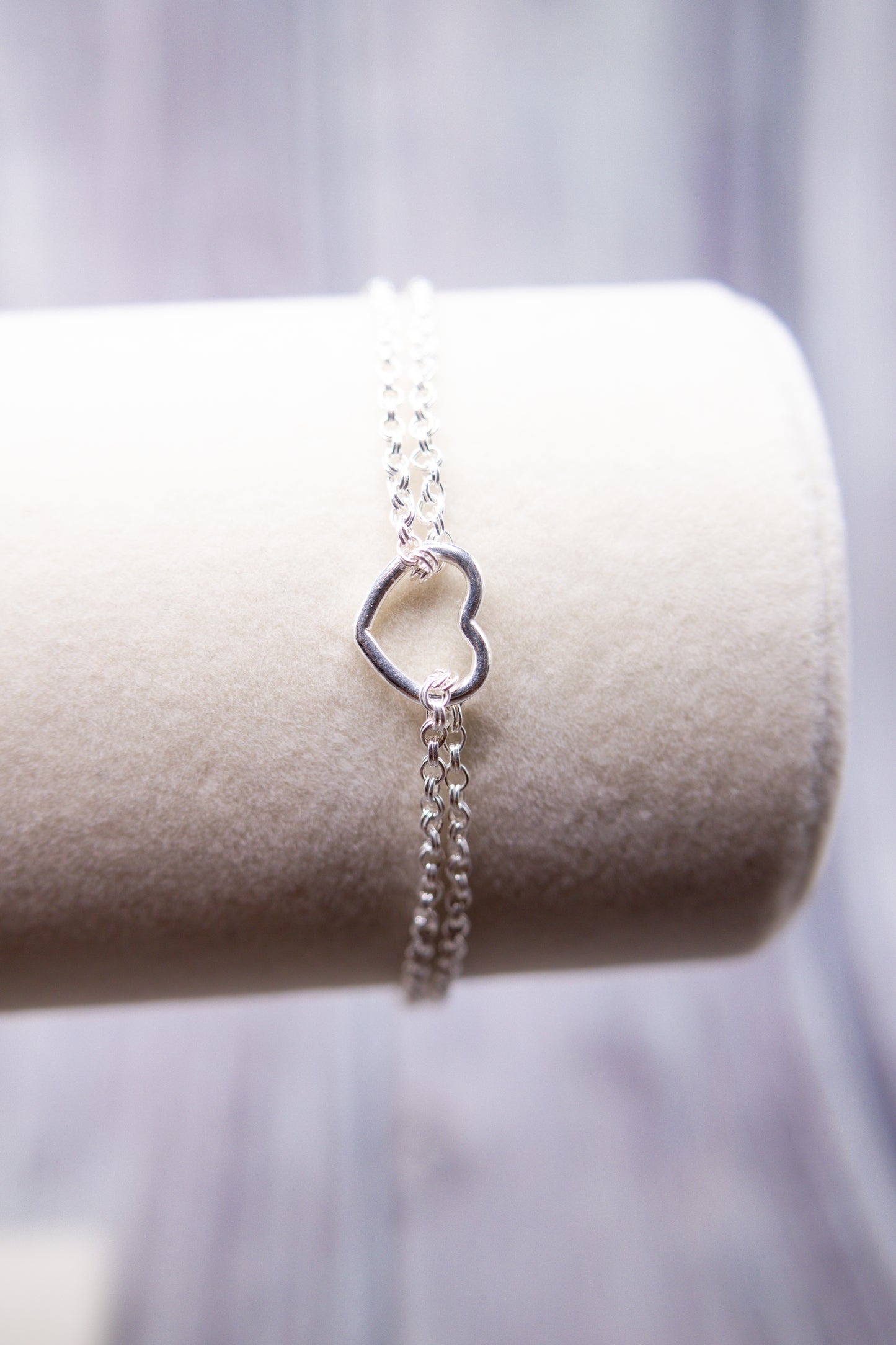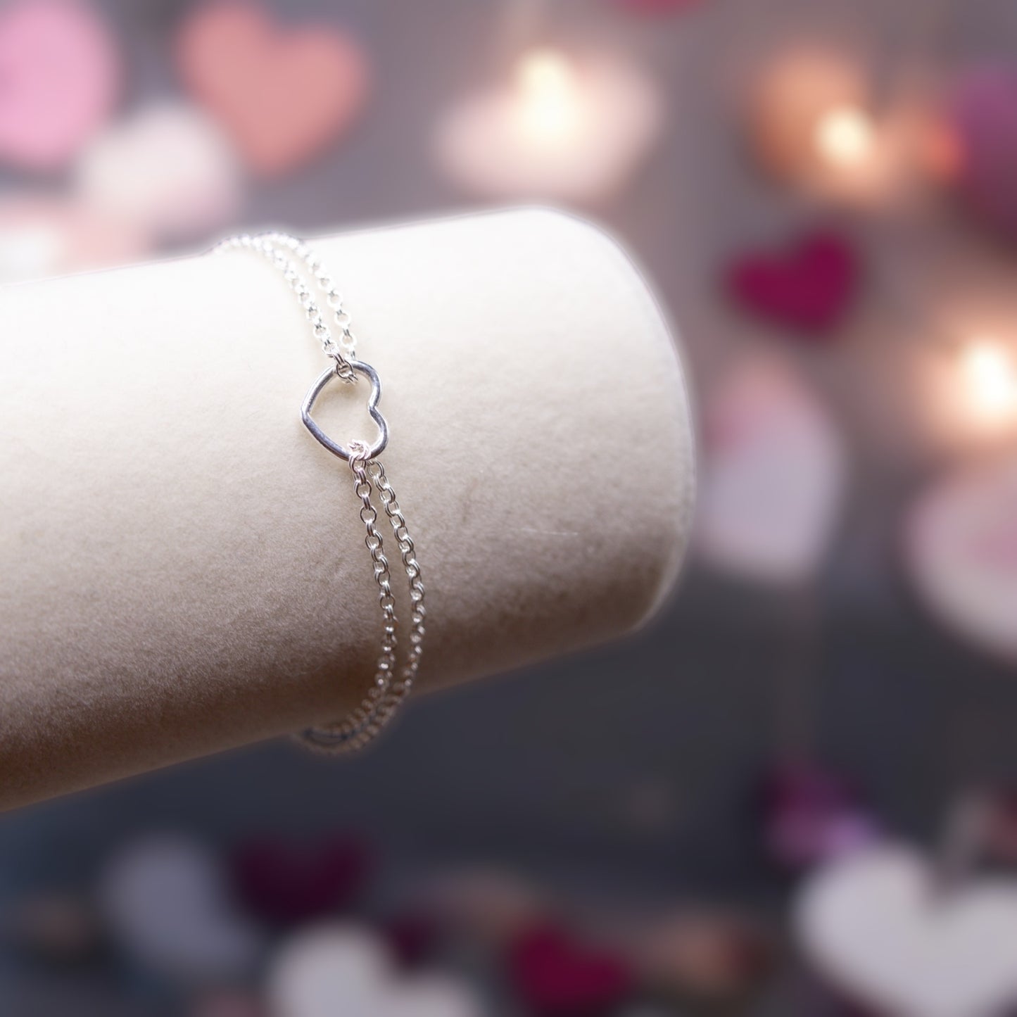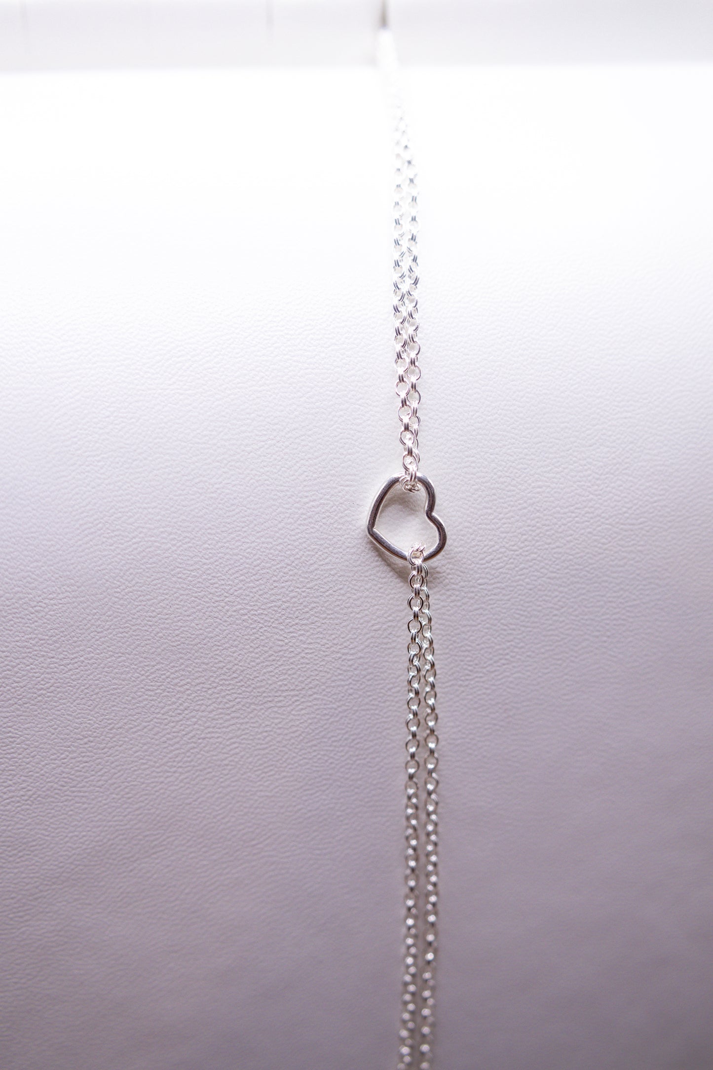 A 1.8mm sterling silver cable chain, double-stranded for added beauty, featuring a heart-shaped connector for an elegant touch. Timeless and perfect for everyday wear.